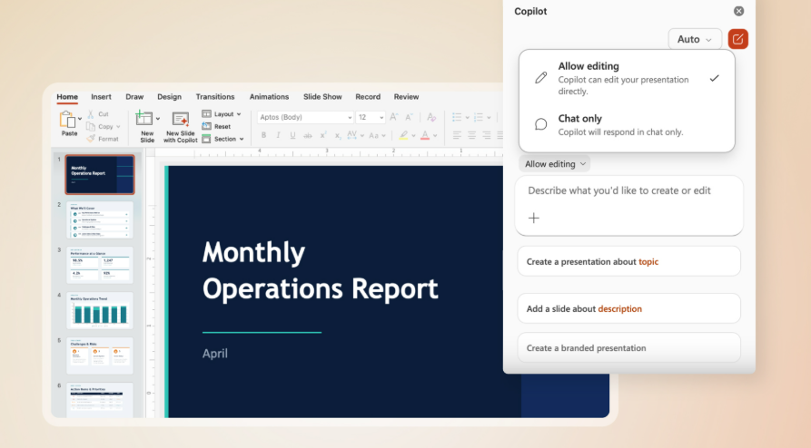 In Word, that means restructuring a document, changing its tone, applying formatting, or adding headings based on a single instruction. In Excel, it means inserting formulas, building pivot tables, generating charts, and transforming data from a description of what you want the output to look like. In PowerPoint, it means updating an existing deck with new data, applying your company’s brand template, or rebuilding slides around a fresh narrative.